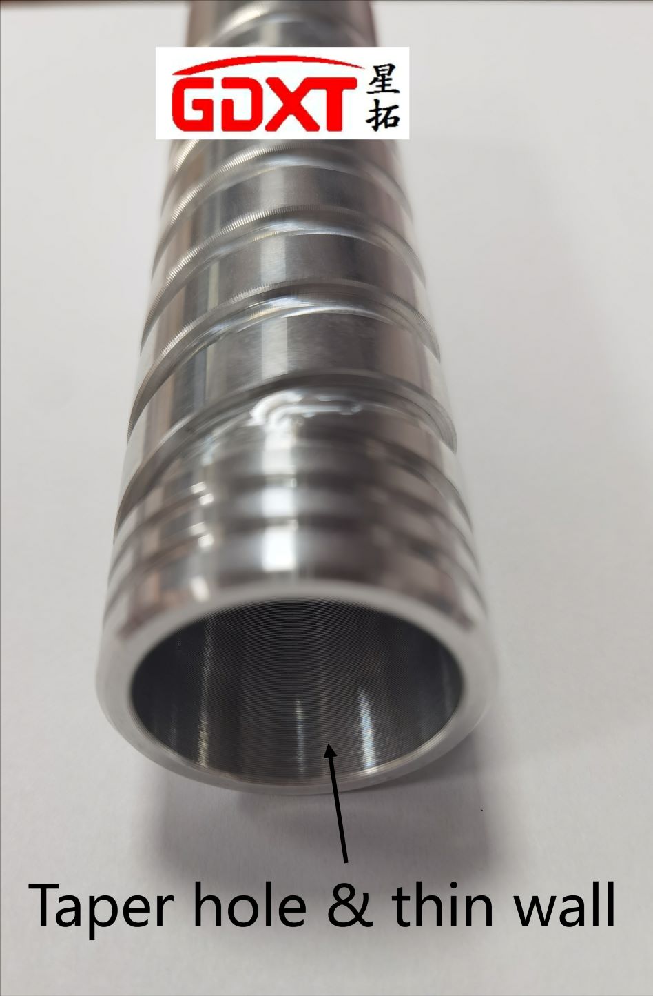双轴双刀塔车铣复合数控车床加工,直径外面动力头铣削加工螺旋冷却水路,端头动力头钻削偏心位置孔,车削带锥度内孔,薄壁,表面粗糙度车削到Ra0.2um,铝合金6063T6。
