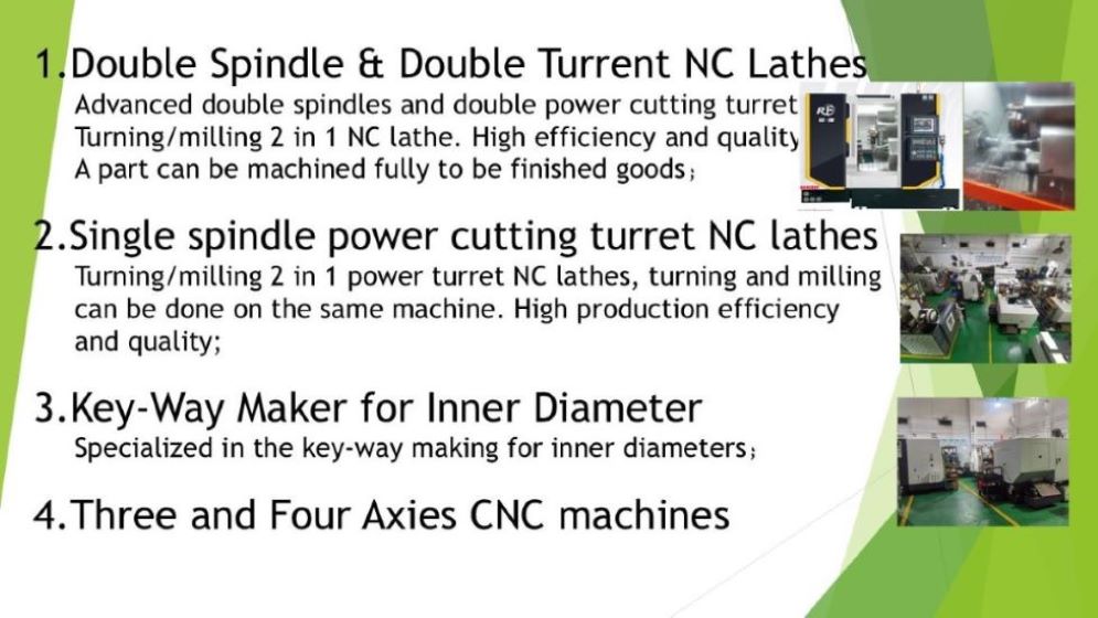 Advanced NC lathes and CNC like turning/milling 2 tin 1 NC lathes, 3/4 Axies CNC, key way maker and verious general machining machines, Keyence Photo measring machine, projector, ualtra sonic testing instrument, dynamic balance tester, imported digital height measuring instrument, calipers, micrometers, etc.